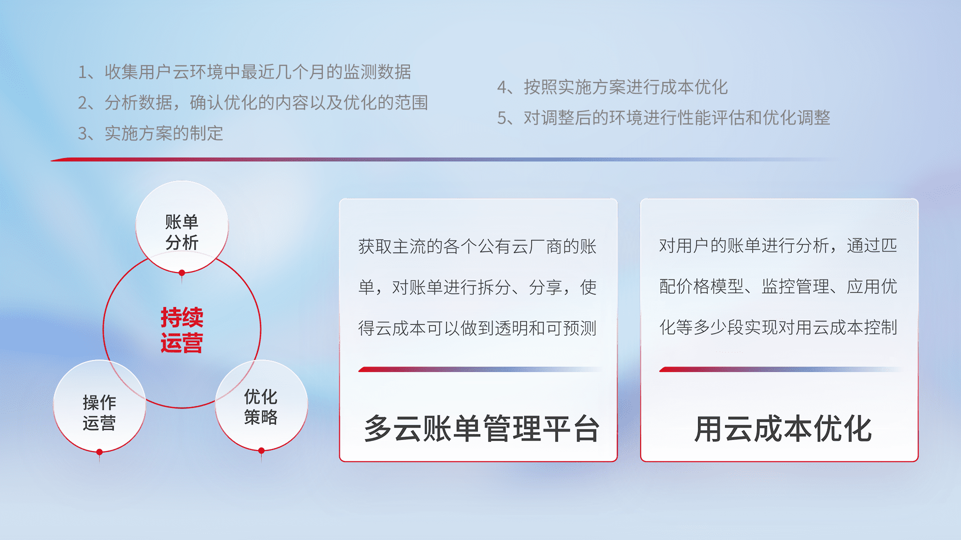 通过多云纳管,,,,以统一的资源数据模型把客户的云资源进行抽象和封装,,,进而实现对多云资源的统一操作,,保障云资源管理的可靠性、、、、稳定性与可用性。。量身定制化运维内容,,,配置、、、开发运维、、、、补丁管理、、备份、、、、监控、、、、认证和访问管理、、、审计和日常巡检等,,,保障在用云过程中的可靠度,,,稳定度以及高可用率。。。