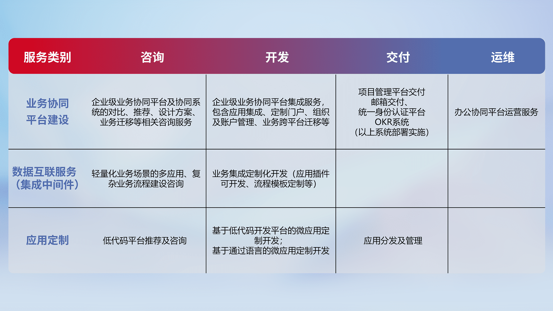 针对钉钉、、企微、、、IDaas等平台级产品提供产品的规划、、、、方案、、、、交付、、、、定制化开发等服务,,,,实现如统一协同办公、、、智能客户服务、、、、混合会议管理、、智能数据查询、、、等业务场景,,实现数字化转型。。